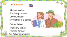 .................................. Unit 13 Lesson 1 (1+2+3) Warm-up Let’s chant. Mother, mother. That’s my mother. Doctor, doctor My mother is a doctor. Father, father. That’s my father. Farmer, farmer. My father is a farmer. Contents Look, listen and repeat. Listen, point and say. Let’s talk.
