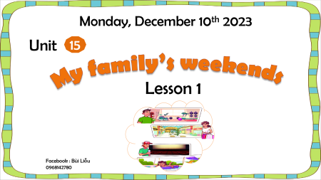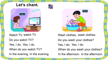 Monday, December 10th 2023 Unit 15 Lesson 1 Facebook : Bùi Liễu 0968142780 Let’s chant. Watch TV, watch TV Wash clothes, wash clothes. Do you watch TV? Do you wash your clothes? Yes, I do. Yes, I do. Yes, I do. Yes, I do. When do you watch TV? When do you wash your clothes?