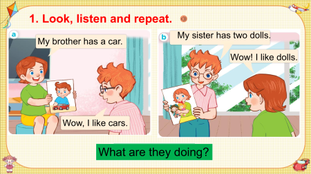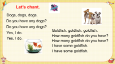 .................................. Unit 17 Lesson 1 (1+2+3) Warm-up Let’s chant. Dogs, dogs, dogs. Do you have any dogs? Do you have any dogs? Yes, I do. Goldfish, goldfish, goldfish. Yes, I do. How many goldfish do you have? How many goldfish do you have? I have some goldfish. I have some goldfish. Contents Look, listen and repeat. Listen, point and say. Let’s talk.