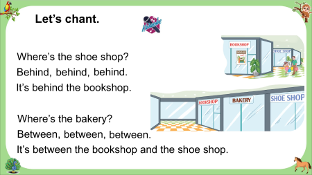 Monday, March 5th 2024 Unit 19 Lesson 1 Let’s chant. Where’s the shoe shop? Behind, behind, behind. It’s behind the bookshop. Where’s the bakery? Between, between, between.