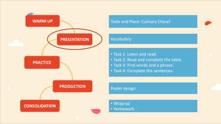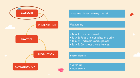 • Task 4: Complete the sentences. PRODUCTION Poster design • Wrap-up CONSOLIDATION • Homework WARM-UP