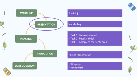• Task 3: Complete the sentences. PRODUCTION Poster Presentation • Wrap-up CONSOLIDATION • Homework WARM-UP Eco Mojo