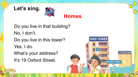 được "hyperlink" thì liên hệ e gửi video hướng dẫn nhé. Let’s sing. Homes Do you live in that building? No, I don’t. Do you live in this tower? Yes, I do. What’s your address? It’s 19 Oxford Street.