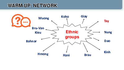 Task 4: Complete the sentences with the words and phrases from the box. FURTHER Task 5: Game: Where are they? PRACTICE CONSOLIDATION Wrap-up Homework WARM-UP: NETWORK Muong Koho Giay Tay Bru-Van Kieu Ethnic Nung groups Bahnar Dao Kinh Hmong Hani Brau