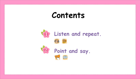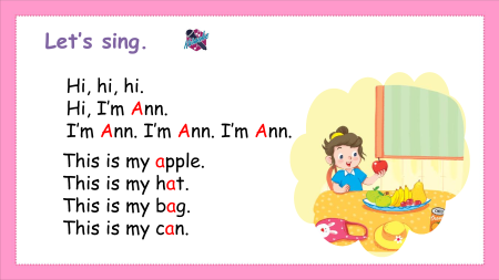 I’m Ann. I’m Ann. I’m Ann. This is my apple. This is my hat. This is my bag. This is my can. Contents Listen and repeat. Point and say.