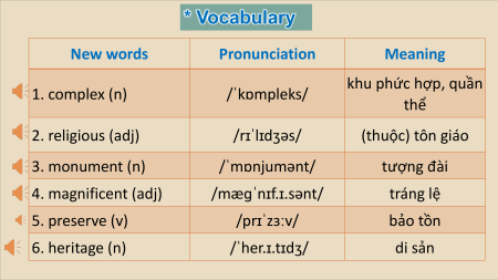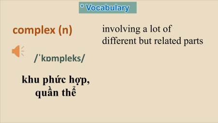 LESSON 1: GETTING STARTED AT AN ENGLISH LESSON complex (n) involving a lot of different but related parts /ˈkɒmpleks/ khu phức hợp, quần thể