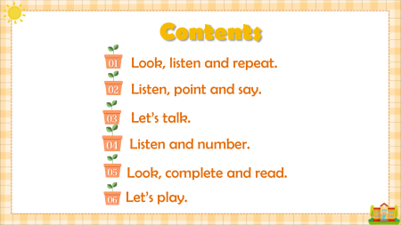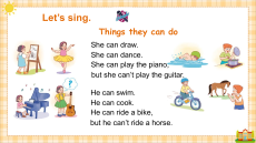 but she can’t play the guitar. He can swim. He can cook. He can ride a bike, but he can’t ride a horse. Contents Look, listen and repeat. Listen, point and say. Let’s talk. Listen and number. Look, complete and read. Let’s play.