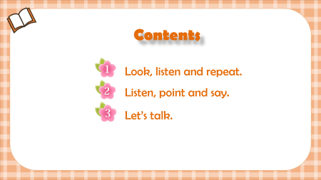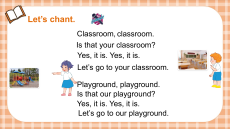 Let’s go to your classroom. Playground, playground. Is that our playground? Yes, it is. Yes, it is. Let’s go to our playground. Contents Look, listen and repeat. Listen, point and say. Let’s talk.