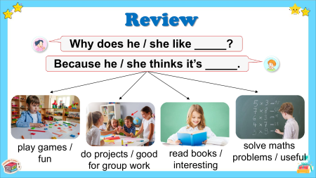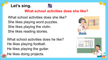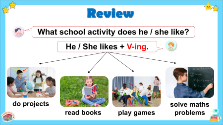 What school activity does he / she like? He / She likes + V-ing. do projects solve maths read books play games problems