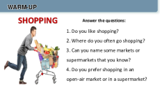 Task 4: Complete the sentences with words and phrases from the box. PRODUCTION Task 5: Game: Listing CONSOLIDATION Wrap-up Homework WARM-UP Answer the questions: SHOPPING 1. Do you like shopping?