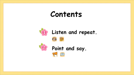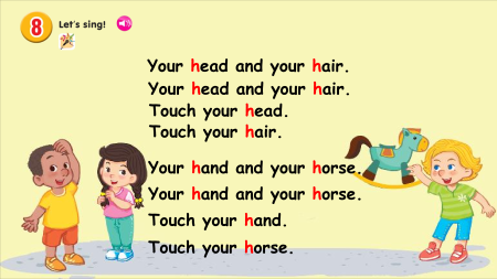Your head and your hair. Touch your head. Touch your hair. Your hand and your horse. Your hand and your horse. Touch your hand. Touch your horse. Contents Listen and repeat. Point and say.