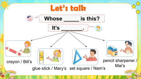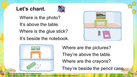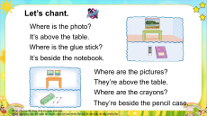 Let’s chant. Where is the photo? It’s above the table. Where is the glue stick? It’s beside the notebook. Where are the pictures? They’re above the table. Where are the crayons?