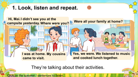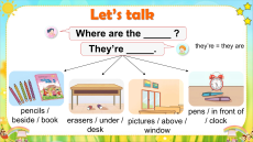 Nhấn vào từng câu để nghe lại, muốn nghe lại bao nhiêu lần thì ấn vào câu đó bấy nhiêu lần. Where are the _____ ? They’re _____. they’re = they are pencils / pens / in front of