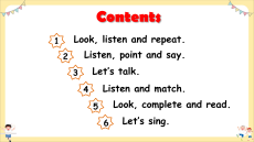 Look, listen and repeat. 2 Listen, point and say. 3 Let’s talk. 4 Listen and match. 5