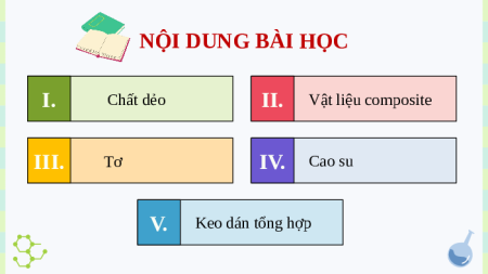 là gì? Chúng có thành phần cấu tạo như thế nào? BÀI 13: VẬT LIỆU POLYMER NỘI DUNG BÀI HỌC I. Chất dẻo II. Vật liệu composite III. Tơ IV. Cao su V. Keo dán tổng hợp