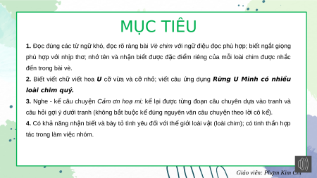 ọ rõ ràng bài Vè chim với ng ữ đi u ệ đ c ọ phù h p; ợ bi t ế ng t ắ gi ng ọ phù hợp v i ớ nh p ị th ; ơ nh ớ tên và nh n ậ bi t ế đư c ợ đ c ặ đi m ể riêng c a ủ m i ỗ loài chim đư c ợ nh c ắ đ n ế trong bài vè. 2. Biết viết ch ữ vi t