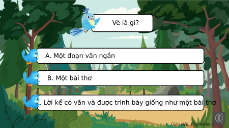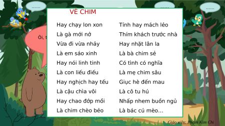 ậ (loài chim); có tinh th n ầ h p ợ tác trong làm vi c ệ nhóm. Fei e styFor o war a d r er e s_0 G 9 0i 68 6 á 1 8o 20 2 6 vi7 6 2 7 ên: Ph m ạ Kim Chi …… …… …… VÈ CHIM Hay chạy lon xon Tính hay mách lẻo À, đó là bài vè chim Cốc… Cố L c à …Cốc Chào mừng bạn gà mới nở Thím khách trước nhà Ôi, thích quá, thích của chúng tớ đấy. Wow, đây là đâu đến với xứ sở của quá. Cậu có muốn tìm mà đẹp th V ế ừ n a ày đi ? vừa nhảy các loà H i ch ay im nhặt lân la hiểu không? Là em sáo xinh Là bà chim sẻ Hay nói linh tinh Có tình có nghĩa Là con liếu điếu Là mẹ chim sâu Hay nghịch hay tếu Giục hè đến mau …… Là cậu chìa vôi Là cô tu hú Hay chao đớp mồi Nhấp nhem buồn ngủ Là chim chèo bẻo Là bác cú mèo… FeistyForwarders_0 G 9i68 á 1 o 206 vi72 ên: Ph m ạ Kim Chi Vè là gì? A. Một đoạn văn ngắn B. Một bài thơ