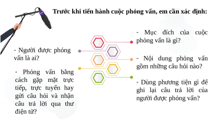 Trước khi tiến hành cuộc phỏng vấn, em cần xác định: - Mục đích của cuộc phỏng vấn là gì? - Người được phóng vấn là ai? - Nội dung phỏng vấn gồm những câu hỏi nào? - Phỏng vấn bằng cách gặp mặt trực