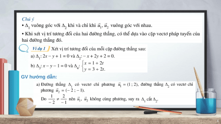 - Trọn bộ bài giảng powerpoint Toán 10 Chương 7 Bài 4: Vị trí tương đối và góc giữa hai đường thẳng Cánh diều năm 2023 hay nhất được thiết kế theo phong cách hiện đại, đẹp mắt giúp Giáo viên có thêm nhiều ý tưởng khi giảng dạy.