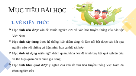 Học sinh nêu được vấn đề muốn nghiên cứu về văn hóa truyền thống của dân tộc Việt Nam