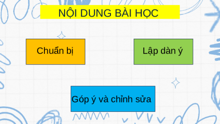 ĐẾN VỚI TIẾT HỌC MỚI TIẾT 3: VIẾT LẬP DÀN Ý CHO BÀI VĂN KỂ LẠI MỘT CÂU CHUYỆN NỘI DUNG BÀI HỌC Chuẩn bị Lập dàn ý Góp ý và chỉnh sửa 01 CHUẨN BỊ