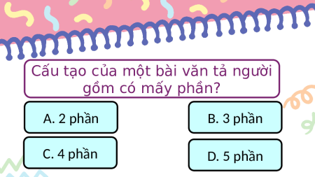 Cấu tạo của một bài văn tả người gồm có mấy phần? A. 2 phần B. 3 phần C. 4 phần D. 5 phần