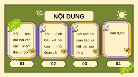 BÀI CHO BÀI VĂN KỂ LẠI MỘT CÂU CHUYỆN NỘI DUNG Xếp các Xác định Viết mở bài Vận dụng mở bài vào kiểu kết bài gián tiếp và các nhóm của mỗi kết bài mở thích hợp đoạn văn rộng 01 02 03 04 01 XẾP CÁC MỞ BÀI