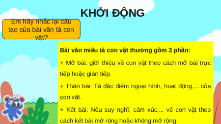 + Mở bài: giới thiệu về con vật theo cách mở bài trực tiếp hoặc gián tiếp.