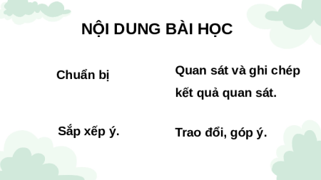 Quan sát và ghi chép kết quả quan sát. Sắp xếp ý. Trao đổi, góp ý.
