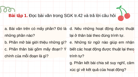 Bài tập 1. Đọc bài văn trong SGK tr.42 và trả lời câu hỏi