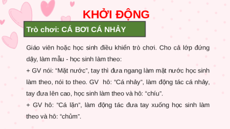 làm theo, nói to theo. GV hô: “Cá nhảy”, làm động tác cá nhảy,