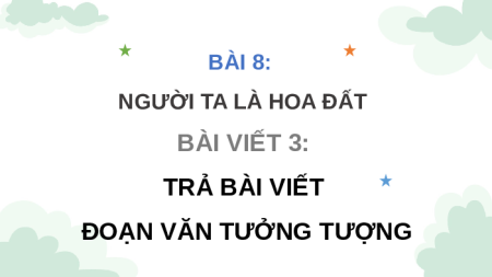 - Bộ bài giảng powerpoint Bài 8: Người ta là hoa đất Tiếng việt lớp 4 Cánh Diều bao gồm đầy đủ các bài giảng trong cả năm. Bộ bài giảng được thiết kế theo phong cách hiện đại, đẹp mắt, trình bày chi tiết cho từng phần học và bám sát chương trình Sách giáo khoa Tiếng việt lớp 4 Cánh Diều.