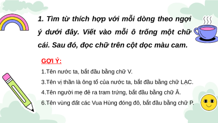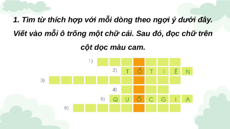 1. Tìm từ thích hợp với mỗi dòng theo ngợi ý dưới đây.