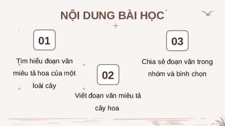 VĂN CHO BÀI VĂN MIÊU TẢ CÂY CỐI NỘI DUNG BÀI HỌC 01 03 Tìm hiểu đoạn văn Chia sẻ đoạn văn trong miêu tả hoa của một nhóm và bình chọn 02 loài cây