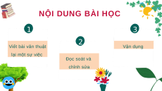phẩm về chủ đề “Uống nước nhớ nguồn”. TIẾT 3. VIẾT VIẾT BÀI VĂN THUẬT LẠI MỘT SỰ VIỆC NỘI DUNG BÀI HỌC 1 3 2 Viết bài văn thuật Vận dụng lại một sự việc Đọc soát và chỉnh sửa