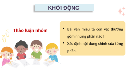 Bài văn miêu tả con vật thường Thảo luận nhóm gồm những phần nào?