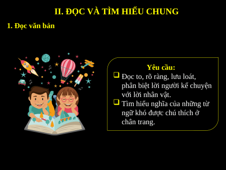 II. ĐỌC VÀ TÌM HIỂU CHUNG 1. Đọc văn bản Yêu cầu: