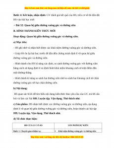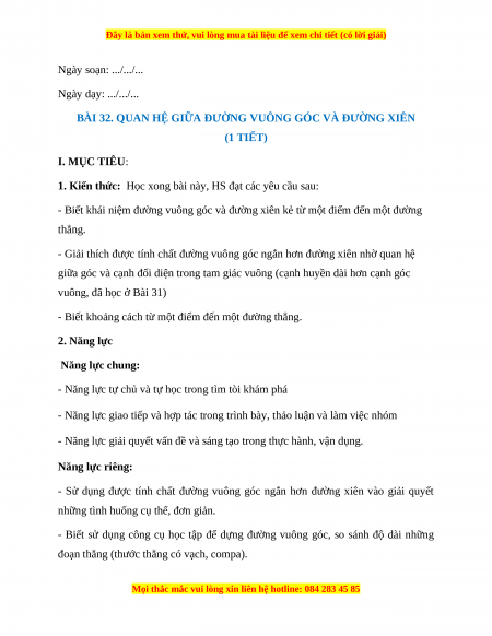 BÀI 32. QUAN HỆ GIỮA ĐƯỜNG VUÔNG GÓC VÀ ĐƯỜNG XIÊN (1 TIẾT) I. MỤC TIÊU: