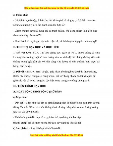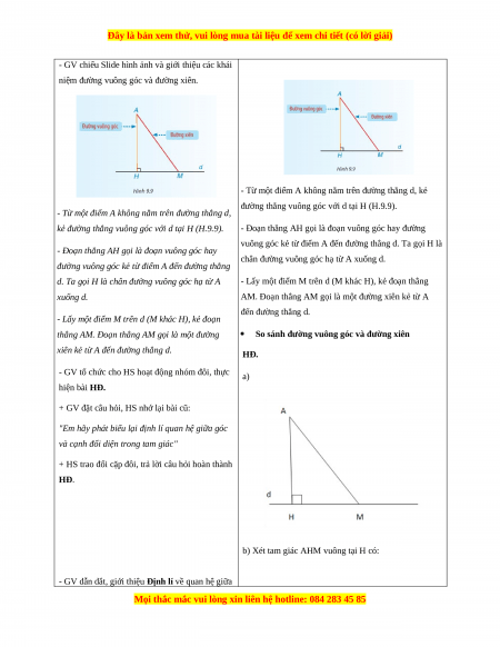 - HS ghi nhớ và nhận biết được các khái niệm đường vuông góc và đường xiên.