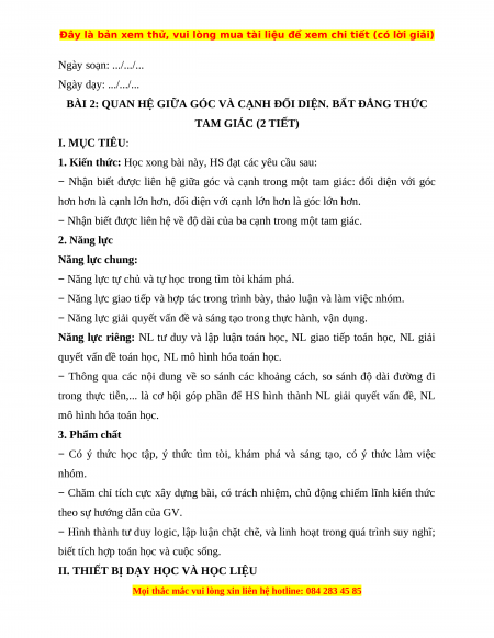 − Nhận biết được liên hệ về độ dài của ba cạnh trong một tam giác. 2. Năng lực Năng lực chung:
