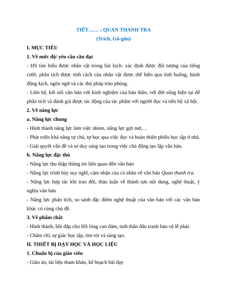 TIẾT…… : QUAN THANH TRA (Trích, Gô-gôn) I. MỤC TIÊU