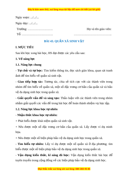BÀI 43. QUẦN XÃ SINH V T Ậ I. M C Ụ TIÊU Sau khi h c ọ xong bài h c, H ọ S đ t ạ được các yêu c u s ầ au: 1. V năng l ề c ự 1.1. Năng l c chung ự