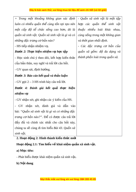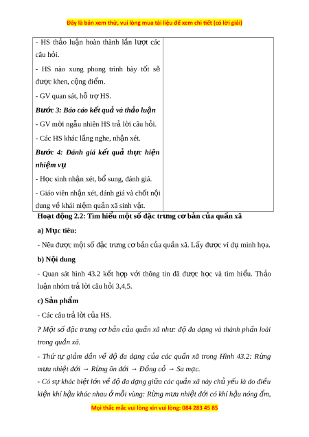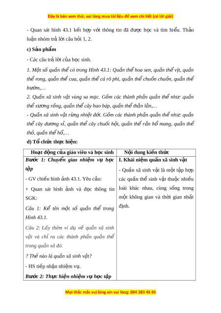 ể có trong Hình 43.1: Qu n ầ th ể hoa sen, qu n ầ th ể v tị, qu n ầ thể rong, qu n ầ thể cua, qu n ầ th ể cá rô phi, qu n ầ th ể chu n ồ chu n, ồ qu n ầ thể bư m ơ ,… 2. Qu n ầ xã sinh v t ậ vùng sa m c. ạ G m ồ các thành ph n ầ qu n ầ thể nh : ư qu n ầ th x ể ư ng ơ rồng, qu n t ầ h cây bao báp, qu ể n t ầ h t ể h n ằ l n,… ằ - Qu n ầ xã sinh v t ậ r ng ừ nhi t ệ đ i ơ . G m ồ các thành ph n ầ qu n ầ th ể nh : ư qu n ầ thể cây dư ng ơ x ,ỉ qu n ầ thể cây chu i ố h t ộ , qu n ầ thể r n ắ hổ mang, qu n ầ thể th , qu o ần th h ể ổ,… d) T ch ổ ức thực hi n: ệ Hoạt đ ng c ộ a g ủ iáo viên và h c ọ sinh N i ộ dung ki n t ế h c ứ Bư c ớ 1: Chuy n ể giao nhi m ệ vụ h c ọ I. Khái ni m ệ qu n xã s ầ inh v t ậ tập - Qu n ầ xã sinh v t ậ là m t ộ t p ậ h p ợ - GV chi u hì ế nh nh 43.1. ả Yêu c u: ầ các qu n ầ thể sinh v t ậ thu c ộ nhi u ề + Quan sát hình nh ả và đ c