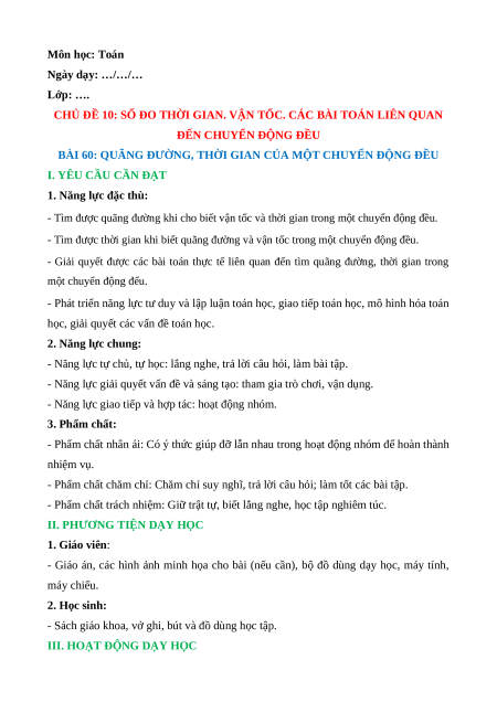 BÀI 60: QUÃNG ĐƯỜNG, THỜI GIAN CỦA MỘT CHUYỂN ĐỘNG ĐỀU