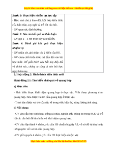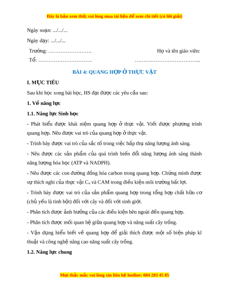 ……………………………….. BÀI 4: QUANG H P Ợ Ở TH C Ự V T Ậ I. M C Ụ TIÊU Sau khi h c ọ xong bài h c, H ọ S đ t ạ được các yêu c u s ầ au: 1. V năng l ề c ự 1.1. Năng l c Si ự nh h c ọ - Phát bi u ể đư c ợ khái ni m ệ quang h p ợ ở th c ự v t ậ . Vi t ế đư c ợ phư ng ơ trình quang h p. ợ Nêu đư c ợ vai trò c a ủ quang h p ợ t ở h c ự v t ậ . - Trình bày đư c vai ợ trò c a s ủ c t ắ ố trong vi c h ệ p t ấ h năng l ụ ư ng ợ ánh sáng. - Nêu đư c ợ các s n ả ph m ẩ c a ủ quá trình bi n ế đ i ổ năng lư ng ợ ánh sáng thành năng lư ng ợ hóa h c ( ọ ATP và NADPH). - Nêu đư c ợ các con đư ng ờ đ ng