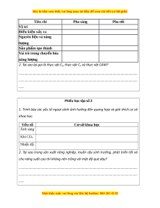 ồ hóa carbon trong quang h p. ợ Ch ng ứ minh đư c ợ sự thích nghi c a t ủ h c ự v t ậ C4 và CAM trong đi u ề ki n m ệ ôi trư ng b ờ t ấ l i ợ . - Trình bày đư c ợ vai trò c a ủ s n ả ph m ẩ quang h p ợ trong t ng ổ h p ợ ch t ấ h u ữ cơ (ch y ủ u l ế à tinh b t ộ ) đ i ố v i ớ cây và đ i ố v i ớ sinh gi i ớ . - Phân tích đư c ợ nh ả hư ng c ở a ủ các đi u ki ề n bên ngoài ệ đ n ế quang h p. ợ - Phân tích đư c m ợ ối quan h gi ệ a quang h ữ p ợ và năng su t ấ cây tr ng. ồ - V n ậ d ng ụ hi u ể bi t ế về quang h p ợ để gi i ả thích đư c ợ m t ộ số bi n ệ pháp kĩ thu t