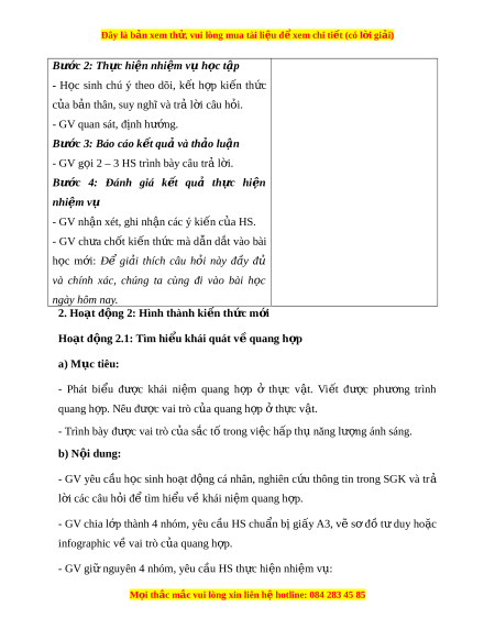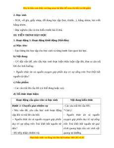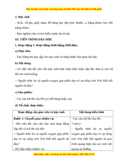Đây là bản xem th , vu ử i lòng mua tài li u ệ đ xe ể m chi ti t (c ế ó l i ờ gi i ả ) 2. H c ọ sinh - SGK, vở ghi, gi y ấ nháp, đồ dùng h c ọ t p ậ (bút, thư c...) ớ , b ng ả nhóm, bút vi t ế b ng ả nhóm. - Đ c nghi ọ ên c u ứ và tìm hi u t ể rư c ớ bài nhà. ở III. TI N Ế TRÌNH D Y Ạ H C Ọ 1. Hoạt đ ng 1 ộ : Ho t ạ đ ng ộ kh i ở đ ng ( ộ M đ ở u) ầ a) M c t ụ iêu: - T o h ạ ng ứ thú h c ọ t p cho h ậ c ọ sinh và t ng ừ bư c l ớ àm quen bài h c. ọ b) N i ộ dung: - GV đ t ặ v n ấ đ , ề yêu c u ầ h c ọ sinh th c ự hi n ệ th o ả lu n ậ c p ặ đôi, đ a ư ra câu trả l i ờ cho tình hu ng: ố + Nguồn th c ứ ăn và ngu n ồ oxygen góp ph n ầ duy trì sự s ng ố trên Trái Đ t ấ b t ắ nguồn t đâu? ừ c) Sản phẩm: - Các câu trả l i ờ c a ủ HS (có th đúng ho ể c ặ sai).
