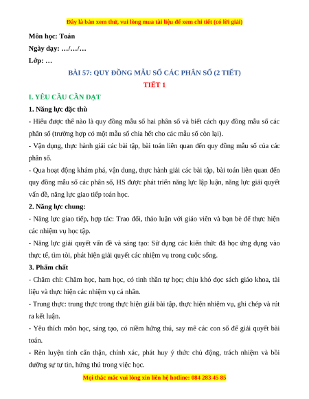 BÀI 57: QUY ĐỒNG MẪU SỐ CÁC PHÂN SỐ (2 TIẾT) TIẾT 1