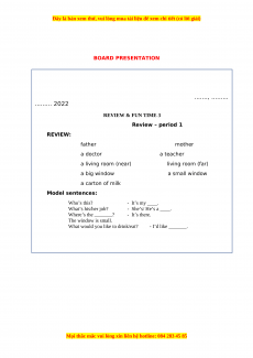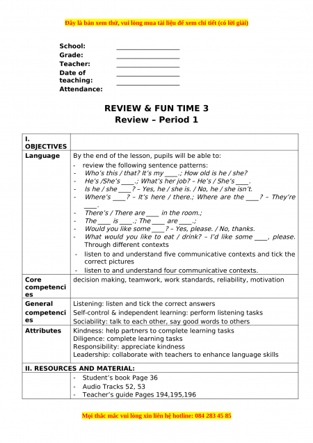 School: ____________________ Grade: ____________________ Teacher: ____________________ Date of ____________________ teaching: ____________________ Attendance: REVIEW & FUN TIME 3 Review – Period 1 I. OBJECTIVES Language