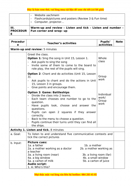 Warm-up and review – Listen and tick – Listen and number – PROCEDUR Fun corner and wrap- up E Procedur Pupils’ Note Teacher’s activities e activities